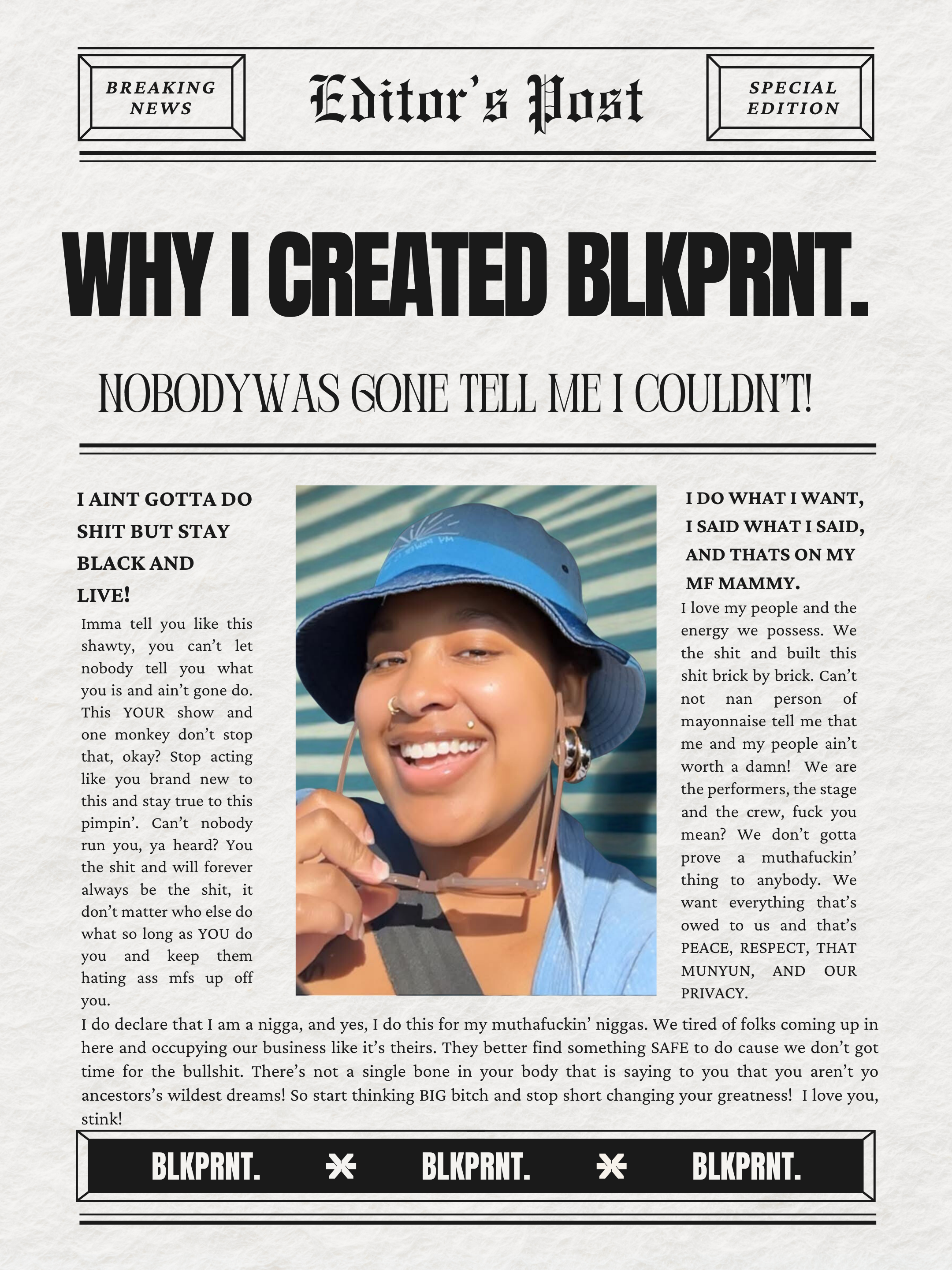 Honey Davis is the multidimensional creative and visionary behind BLKPRNT, a media platform dedicated to amplifying truth, honoring community and protecting the futures of black creatives & entrepreneurs.